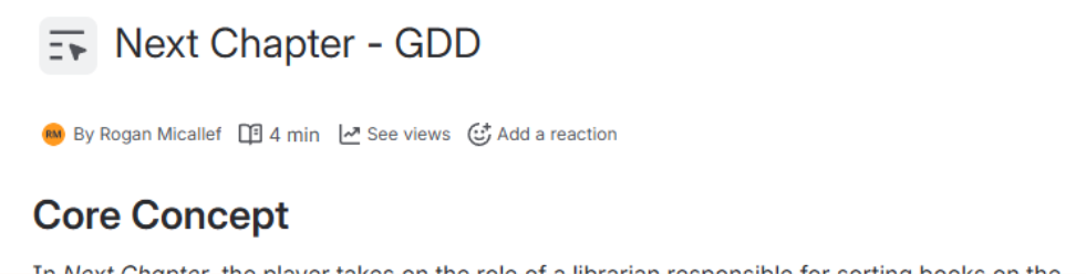 After receiving valuable feedback from our advisor throughout check-ins, I took on the responsibility of creating an overarching GDD that would hold onto all valuable information viewable at a glance, as opposed to the previously individualized (albeit detailed) documents. This has allowed me to maintain a live page that holds all of our high-level design decisions including - but not limited to - design pillars and our development timeline.