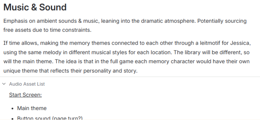 I have continued to keep this page up-to-date with recent developments such as the character profile of our protagonist’s partner who will be met within some sections of the game, as well as copying over the audio asset list from its own document (which itself was written by our lead sound designer), providing all team members with the necessary rundown in a compact and digestible way.