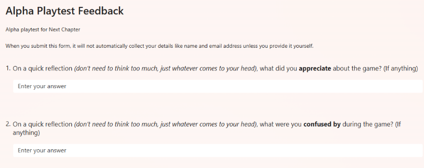In preparation for the official Alpha Playtesting, I was responsible for assembling the playtest form, and although it is still a work in progress (at the time of writing this), I have set the foundations for information we are wanting to dissect during these sessions - what is appreciated, confusing, and what is the priority as we move forward: