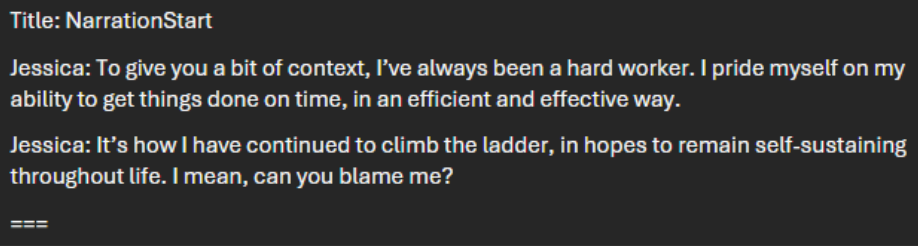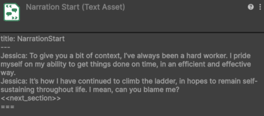 I was tasked with handling the narration that occurs in-game between memories. In doing so, I wanted to keep the text concise but detailed enough to effectively set-up the coming scene. This was a bit tricky, as I wanted to make the narration feel natural in the context of our character telling someone about her past while providing the necessary information to the player. Inspired by the other narrative lead, I wrote this in a way that makes it easy to translate into YarnSpinner, here’s an example of this:
