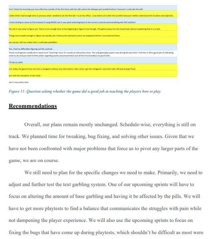 From there, it was just a matter of properly filling in the report by section, inferring from our data and getting my team's perspective as needed. With a clear spreadsheet, I was easily able to show our data that led to our thoughts and decisions from the playtests. We were lucky that our finding revealed few major issues with our game as a whole, so we were able to talk and effectively plan for the coming weeks of beta for the changes we needed to make. And once the report itself was done, I sent it off to the team to look over to ensure everything needed was included and there were no issues. So once they made a few small edits for clarity, we were able to submit the report on time without issues.