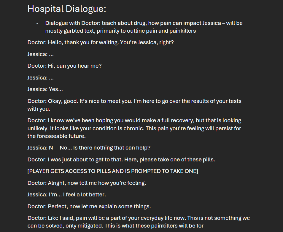 After sending this off to my team, I got their feedback and made changes accordingly. I mainly just needed to shift dialogue around to put the brunt of it after Jessica takes the pills. This is because I forgot about the text garbling during the pain. But after I altered that, everyone agreed it was good enough for implementation and we were able to put it into the game properly